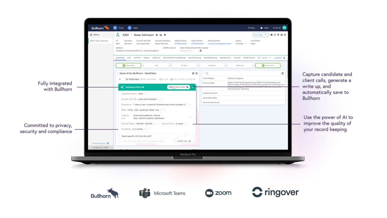 Kyloe AI NoteTaker for Bullhorn: The best conversational AI for all your recruitment calls.